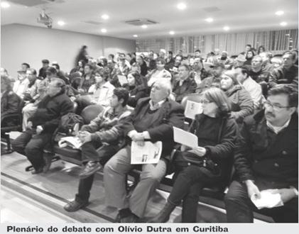 Curitiba: no dia 15, no Espaço Cultural e Esportivo dos Bancários, Olívio debateu com os mais de 130 petistas presentes. Uma das questões, destacadas por todos os componentes da mesa foi a decisão do PT municipal de abrir mão da candidatura própria para apoiar o ex-tucano Gustavo Fruet, hoje no PDT. Cláudio Ribeiro, fundador do PT destacou: A Direção que hoje comanda os destinos do PT tem compromissos com a conservação do sistema” destacando que “a promoção do inchaço do PDT para abrigar os descontentes de outras legendas e fortalecê-lo como aliado é um dos mecanismos desta lógica perversa.