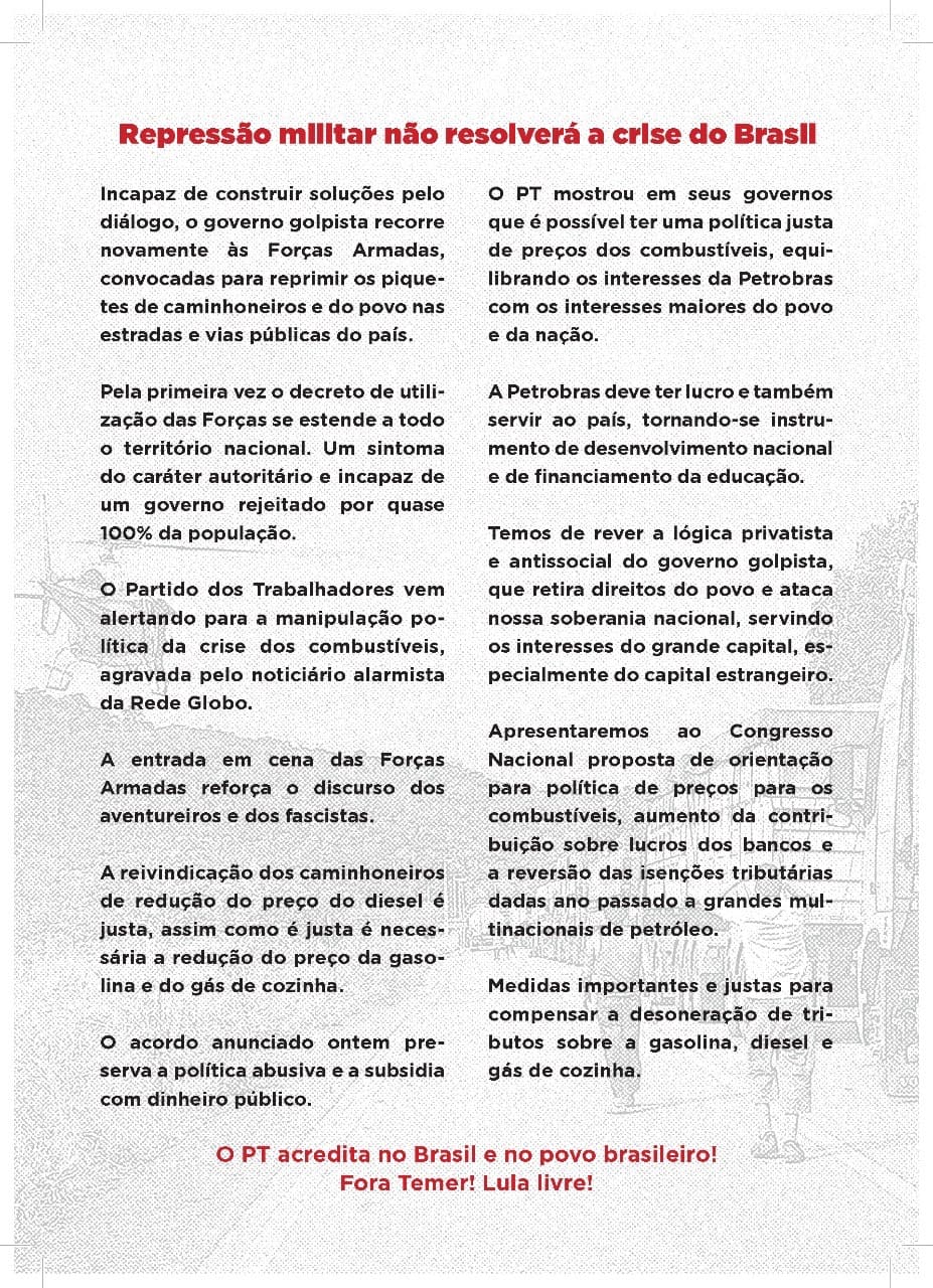 Colocamos a disposição de todos os militantes, nota do PT para ser distribuída nas redes sociais e impressa para ser distribuída em atividades de rua. Pedimos à todos que compartilhem esta nota entre companheiros, vizinhos e familiares, colegas de trabalho, de escola ou faculdade, para explicar a posição do partido diante da crise política em que os golpistas deixaram o país.