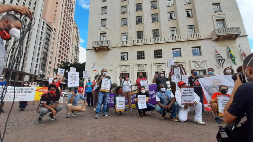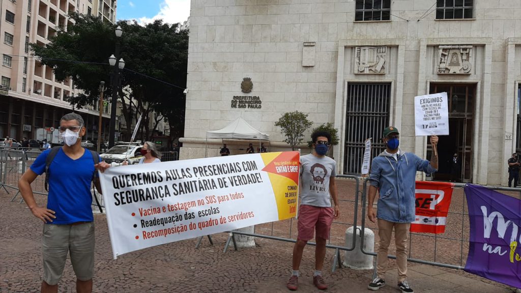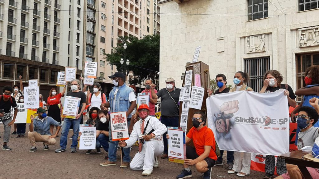 Os presidentes do Sindsep, Sergio Antiqueira, e do Sindicato dos Médicos, Victor Dourado, denunciaram o prefeito Covas pela falta de medidas efetivas – testagem, vacinas, auxilio emergencial entre outras – para o combate à pandemia da covid-19. Eles se juntaram à maioria dos que tomaram a palavra ao responsabilizar Bolsonaro pelas 340 mil mortes no país. Renata Scaquetti , dirigente do SindSaude, falou “não temos nada a comemorar. E sim exigir que os governos Doria e Covas parem de fechar hospitais e que contratem profissionais para atender o povo. E para o governo federal, uma só palavra: Fora Bolsonaro Já”.