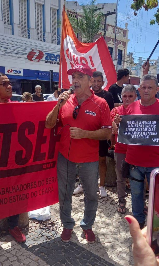 Em Fortaleza, Ceará, Roberto Luque explica no ato a luta pela redução da jornada de trabalho e pela revogação da reforma trabalhista