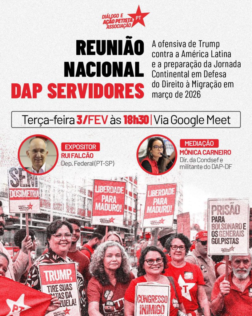 No mesmo dia (3/2), o DAP Servidores Federais também realizou sua plenária. Passaram pela reunião online 70 pessoas de 6 Estados. A atividade contou com a presença do deputado federal Rui Falcão (PT/SP), um dos 18 delegados brasileiros que participou da Conferência em Defesa do Direito de Migrar, ocorrida no México em 28 de setembro de 2025, ele que destacou na plenária que a luta em defesa do direito de migrar, portanto a luta para derrotar Trump, integra a luta no Brasil contra a extrema-direita e se relaciona com a batalha para reeleger Lula agora em 2026. Todos saíram da atividade com o compromisso de impulsionar a Jornada Continental de 8 a 14 de março em seus Estados, organizando atos públicos onde possível.