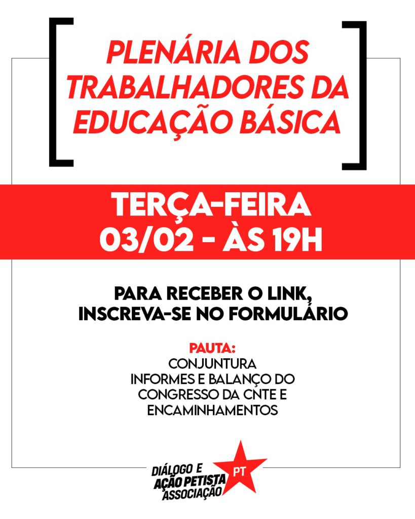 Mais de 70 trabalhadores da educação básica de pelo menos 10 estados do país se reuniram numa Plenária Nacional online do Diálogo e Ação Petista nesta terça (3), para debater a conjuntura internacional e nacional e os resultados do Congresso da CNTE, os participantes assumiram um compromisso com a construção da Jornada Continental Pelo Direito à Migração de 8 a 14 de março. Além disso, a Plenária também concluiu pelo engajamento em uma série de lutas da classe trabalhadora e específicas da categoria, dentre elas, a presença no 8 de março; a construção da Marcha da Classe Trabalhadora, prevista pela CUT para meados de abril; revogação das reformas trabalhista e da previdência, o fim da escala 6 x 1, e a reforma política com Constituinte; dentre outras pautas.