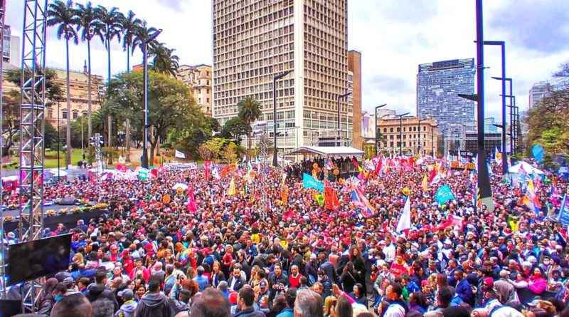 A Praça Tancredo Neves, no centro de Florianópolis, ficou abarrotado de gente neste domingo, 18, no comício Lula Presidente. Num
