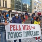 Indígenas fizeram ato em frente à Catedral Metropolitana de Florianópolis contra o marco temporal, contra o PL 490/2003 e pela imediata demarcação das terras indígenas.